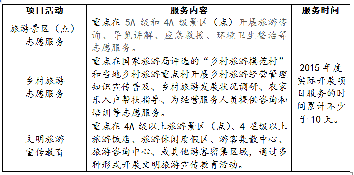 各学院、各部门、各同学: 根据国家旅游局“关于组织开展2015年度“万名旅游英才计划”的通知》(旅办函[2015]219号),依据《国家旅游局“万名旅游英才计划”实施方案》(以下简称《方案》),学校(院)将组织开展“研究型英才培养项目”、“创新创业型英才培养项目”、“实践服务型英才培养项目”和“‘双师型’教师培养项目”的申报工作。现将有关事项通知转发如下: (一)研究型英才培养项目:面向重点公办普通高校(研究机构)在读博士研究生,共遴选资助300名博士研究生,每所院校申报人数不限。 (二)创新创业型英才培养项目:面向重点公办普通本科院校本科在校生,共遴选资助100个项目团队,每个项目团队不少于4人,上海师范大学可申报4个项目。 (三)实践服务型英才培养项目:面向专科在校生,共遴选资助300个项目团队,每个项目团队不少于6人,上海旅游高等专科学校可申报10个项目。 (四)“双师型”教师培养项目:面向重点公办普通高职高专院校和中等职业学校 “双师型”专职教师,共遴选资助300名教师,其中高职教师200名,中职教师100名,上海旅游高等专科学校可申报人数为7人。 申报人员须具备《方案》中规定的基本条件。 (一)在校生 1.非第一年入学新生。 2.学习成绩优异,综合素质突出。 3.热爱旅游行业,立志投身旅游工作。 4.已与旅游行业、企业达成就业意向的优先考虑。 5.“研究型英才培养项目”还需具备下列条件:具有较强的科研能力和创新精神,在旅游相关专业领域内科研成绩较为突出。取得下列成绩之一: a.发表论著。 b.在国内外核心期刊发表论文。 c.在全国性学术会议发表主题演讲或论文。 d.在行业领域内有发明或专利申请。 6.“创新创业型英才培养项目”还需具备下列条件:具有科学的思维方式、较强的创新意识和实践能力,在专业实习、行业认知等实践教学环节中表现突出。 7.“实践服务型英才培养项目”还需具备下列条件:在校期间积极参与志愿服务、社会实践等活动,乐于参与公益活动。 (二)“双师型”教师 具备相应的实践经验或应用技能的教师,取得以下成绩之一: 1.具有相应专业的职业资格证书或技能等级证书。 2.近三年在旅游企事业单位累计实践锻炼半年以上,熟悉旅游相关领域服务与管理流程。 3.主持旅游企事业单位课题,获委托方认可采用,并取得一定的社会效益或经济效益。 4.直接指导的学生在专业技能、创新创业竞赛中获得佳绩,且本人获指导教师奖。 (一)研究型英才培养项目。 2015年度该项目支持入选人员开展下列15个方向其中之一的理论或实践应用研究:1. 旅游市场秩序。2. 文明旅游。3. 旅游安全体系。4. 旅游公共服务体系。5. 旅游经济核算及统计体系。6. 旅游业态、产品、商业模式创新。7. 旅游扶贫。8.乡村旅游。9.旅游区域合作与开发。10.旅游经济与金融。11.旅游国际化。12.旅游产业政策与发展战略。13.“旅游+”理论与实践。14.旅游教育与国际比较。15.旅游产业信息化。 (二)创新创业型英才培养项目 2015年度该项目支持项目团队结合所在地方(区域)旅游业发展,开展1.特色旅游项目、产品规划开发方案设计,2.特色旅游商品、纪念品开发方案设计,3.旅游目的地、旅游项目、产品宣传推广营销方案设计,4.智慧旅游项目、系统、产品开发设计等四类产业创新设计实践活动其中一类活动。活动形式包括项目调研、咨询论证、方案设计、项目推广,并积极探索开展项目的产业与市场转化、应用等活动。 (三)实践服务型英才培养项目 2015年度该项目支持项目团队开展1.旅游景区(点)志愿服务,2.乡村旅游志愿服务,3.文明旅游宣传教育等三类行业实践服务活动其中一类活动。各类活动的基本要求为: