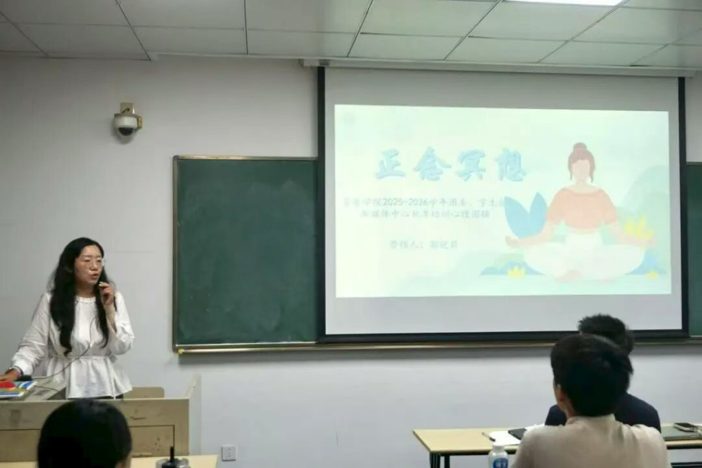 音乐学院兼职辅导员郭晓莉老师带来正念冥想专题培训,传递实用的心理调节方法。郭老师深入浅出讲解正念原理:“正念,就像看见‘想法的汽车’驶过,不跟随奔跑,只静静观察,最终回归当下。” 在老师的温柔引导下,全体成员进行了正念冥想体验,在呼吸之间放松身心,共同学习如何为情绪减压,为高效工作和学习筑牢心理基础。