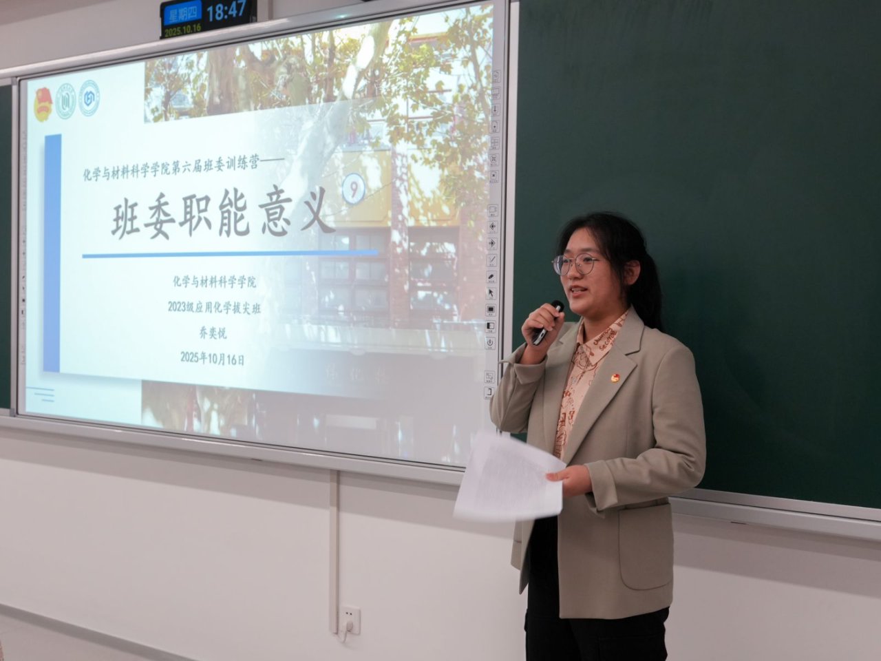2023级应化拔尖班班长乔奕悦从班委的具体职责、班委结构、班委工作分工等方面分享帮助各位班委更好了解自身的职责,从而更好开展工作。在分享中她提到作为班级的核心力量,班委要和班级同学之间搭建好桥梁,打造一个有温度的班集体。