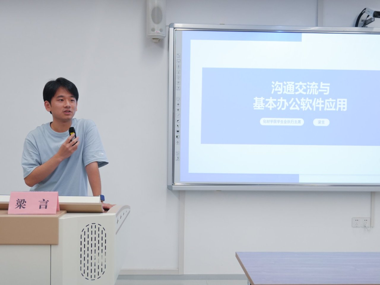 学院学生会执行主席梁言,与班委们分享关于沟通与办公技能的经验。他围绕文件格式的整理展开讲解,强调文件命名的重要性,同时还介绍了办公软件的核心用法。在通知编写环节,他指出通知需明确对象、时间、地点、内容四要素。此外,他还指出邮件沟通时需选用正式邮箱、保证话术礼貌简洁。最后他强调,学生工作需注重团队协作,班委应将技能运用到实践中,通过交流学习提升工作效率。