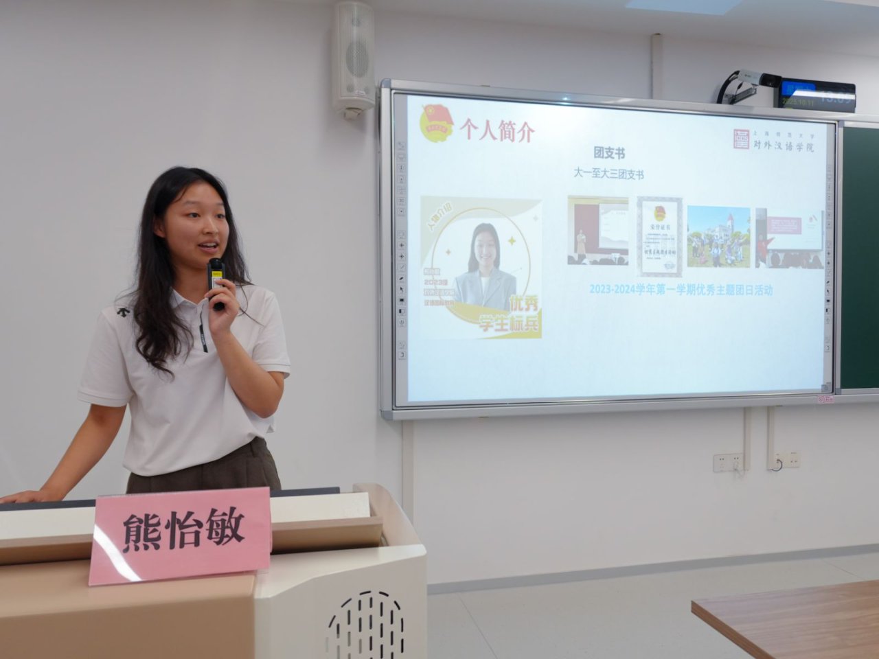 对外汉语学院第二十一届团委(学生)副书记熊怡敏,分享关于十佳团日的经验。她指出在评选十佳主题团日时,班团骨干应紧扣官方主题、结合专业特色,注重内容质量、参与度与创新呈现,评选活力团支部时要结合专业亮点展示风采,学习借鉴优秀院校经验。同时她还强调落实“班团一体化”机制,团支部应协同班委会推进班级思想引领与事务管理,鼓励各班委发挥优势、积极参与评选,展现支部活力。