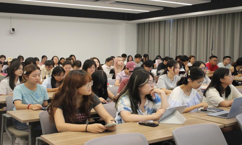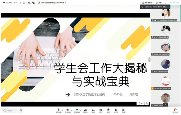 2025年10月17日下午,活动特设“朋辈交流”专题,对外汉语学院学生会主席团成员陈熙瑶进行主题为“朋辈帮帮忙:学生会工作大揭秘与实战宝典”的分享,包含:学生会框架、各部门工作和工作中的使用技巧,带着满满赤诚,将实战经验倾囊相授。