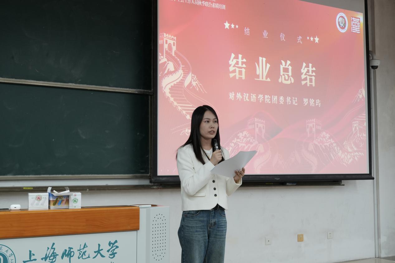 活动尾声,对外汉语学院团委书记罗铭玙作结业总结。她紧扣学习党的二十大精神、贯彻青年工作论述、深化学生会改革成果等核心目标,对两院团委学生会工作人员提出三点期望,希望大家借培训深化对团学工作的认知,携手开创工作新局,为同学、学院和学校的发展贡献青春力量。