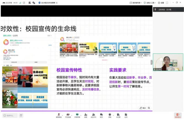 校团委媒体宣传中心副主任沈小棋,从“时效性”“责任心”剖析学生工作底层逻辑,讲清 “为何重时效” 、“校园新媒体账号的定位与差异化打造”等探索“工作+宣传”破圈路等内容,进行“融媒赋能·青春领航:学生工作与新媒体运营的双向奔赴”主题讲解。