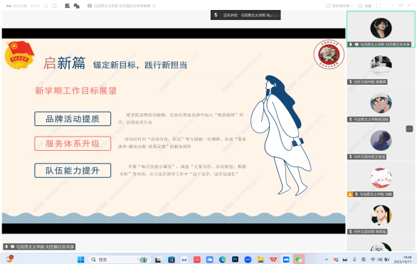 马克思主义学院团委(兼职)副书记刘艺霏开展“悟思想·强本领·启新篇”主题讲解。她分享了典型服务案例,引导两学院团学干部树立主动服务意识,明确以同学需求为导向的工作核心。同时,刘艺霏通过讲解Excel工具用法,提升效率,通过情景模拟教学传授沟通与汇报技巧,助力学子建立工作思维、锚定目标奋进。