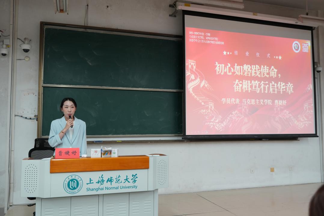 马克思主义学院社团管理部负责人曹婕妤同学作为学员代表分享学习心得。她认为此次培训深化了学员对服务使命的认知,系统学习党的二十大精神强化了政治素养,课程助力综合能力提升,更促其与集体共成长。