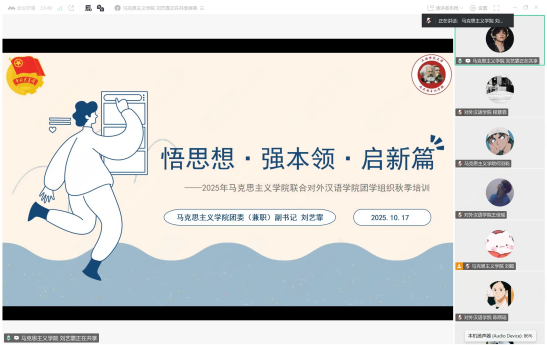 2025年10月11日下午,马克思主义学院、对外汉语学院团委学生会秋季联合素质培训开班仪式在奉贤校区大学生发展中心B座302举行。马克思主义学院团委书记宋易男、马克思主义学院第十八届执行主席刘懿及两院团委学生会全体工作人员出席。活动由马克思主义学院第十八届执行主席刘懿主持。